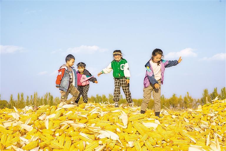 秋收之后,孩子们在玉米垛上玩耍。通讯员 胡健 摄