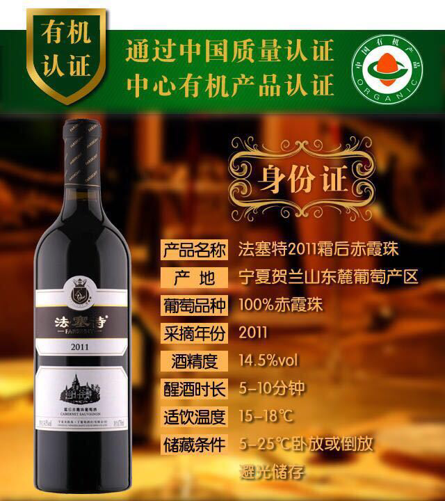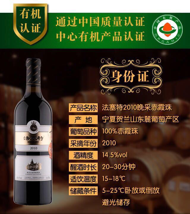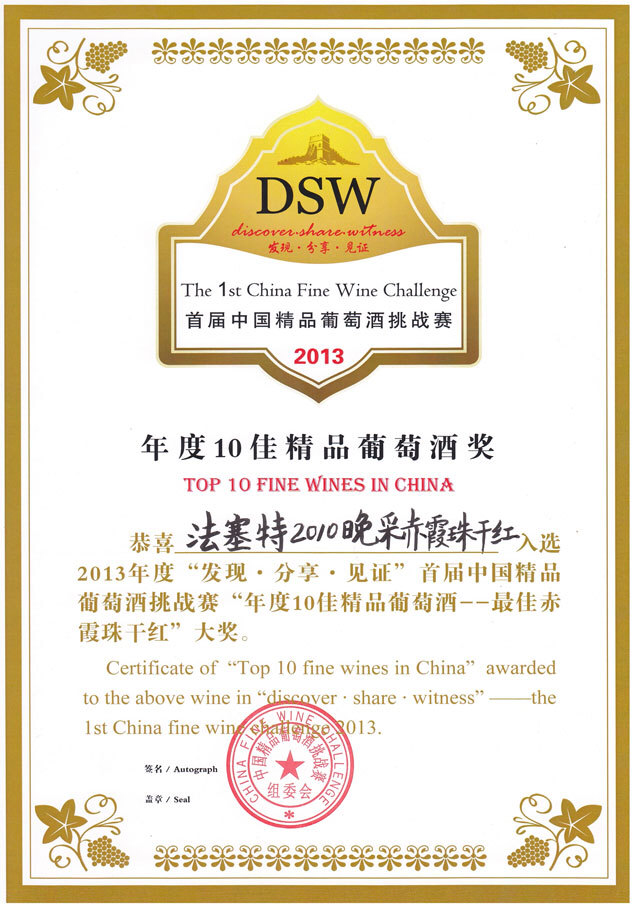 2013年9月,在香港举办的首届中国精品葡萄酒挑战赛上,“法塞特2010晚采赤霞珠干红葡萄酒”一举夺得冠军。