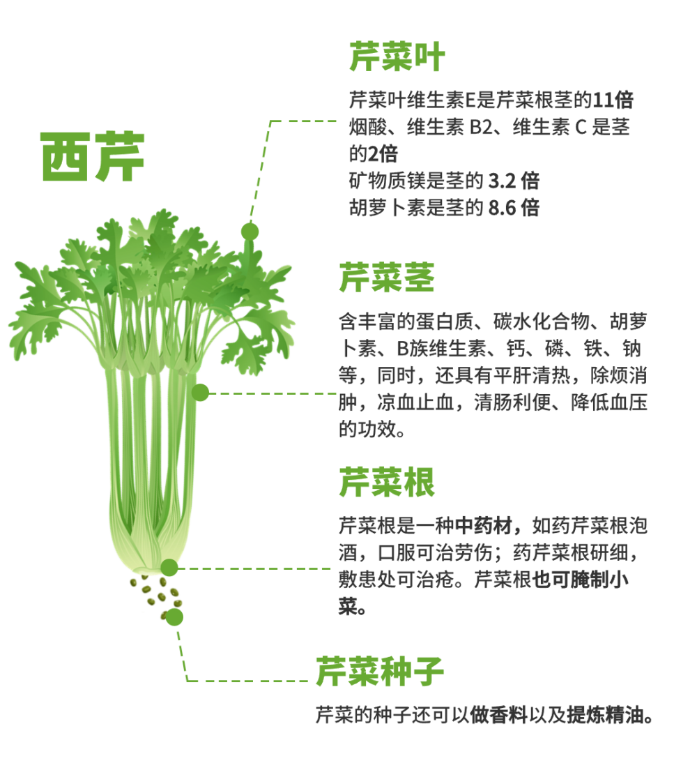 (芹菜叶维生素E是芹菜根茎的11倍;烟酸、维生素 B2、维生素 C 是茎的2倍;矿物质镁是茎的 3.2 倍;胡萝卜素是茎的 8.6 倍。)