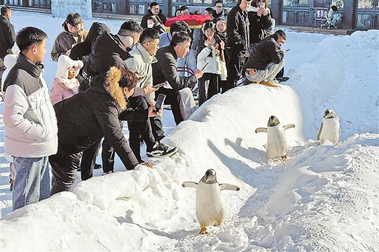 2月4日,贺兰山冰雪大世界企鹅谷,几只憨态可掬的企鹅与游客互动。 记者 王鼎 摄