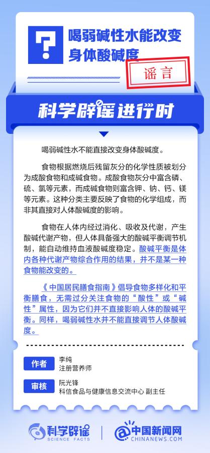中新网10月12日电 喝弱碱性水不能直接改变身体酸碱度。食物根据燃烧后残留灰分的化学性质被划分为成酸食物和成碱食物。成酸食物灰分中富含磷、硫、氯等元素,而成碱食物则富含钾、钠、钙、镁等元素。这种分类主要反映了食物的化学组成,而非其直接对人体酸碱度的影响。食物在人体内经过消化、吸收及代谢,产生酸碱代谢产物,但人体具备强大的酸碱平衡调节机制,能自动维持血液酸碱度稳定。酸碱平衡是体内各种代谢产物综合作用的结果,并不是某一种食物能改变的。(来源:@科学辟谣 中国新闻网微博)