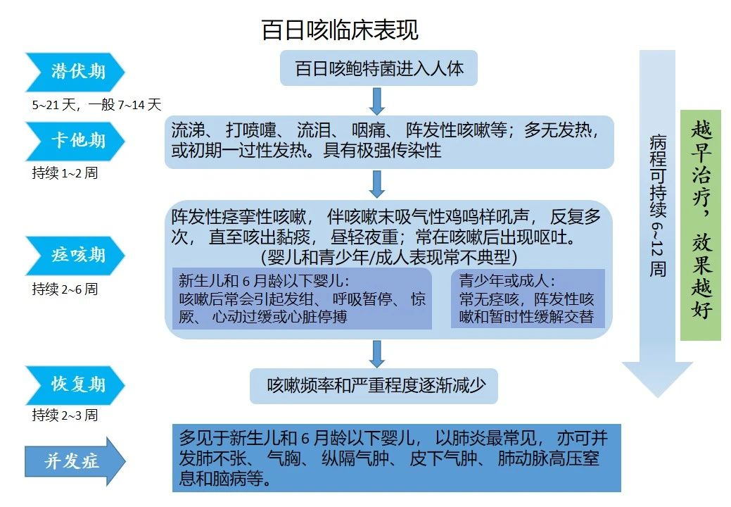 咳咳咳不停,久咳不愈需警惕,小心百日咳!如何正确认识、有效预防百日咳——儿童健康的隐形杀手,快快收好这份指南! 百日咳是《中华人民共和国传染病防治法》规定的乙类传染病。由于接种疫苗后产生的免疫力衰减和百日咳鲍特菌变异,全球很多疫苗覆盖率较高的国家出现了“百日咳再现”,发病年龄高峰从婴幼儿转移至青少年及成年人,青少年及成年人成为婴儿百日咳的主要传染源。 一、什么是百日咳? 百日咳(Pertussis,Whooping Cough)是由百日咳鲍特菌(Bordetella Pertussis)感染引起的急性呼吸道传染病。 典型表现包括阵发性咳嗽、吸入性哮声和咳嗽后呕吐。病程可长达2-3个月,故有百日咳之称。 二、流行病学 传染源:患者、带菌者。 传播途径:主要通过呼吸道飞沫传播,也可经密切接触传播。 易感人群:人群普遍易感。无免疫史的婴幼儿发病风险更高。患儿年龄越小,出现并发症和重症的风险越高。 三、临床表现 四、治疗 1、一般治疗 按呼吸道传染病隔离;对症支持治疗;痉咳严重时避免误吸,可侧卧、坐起或抱起,轻叩背部,助痰排出;适时采取吸痰、吸氧;做好气道护理,预防窒息。 2、抗菌治疗 首选大环内酯类抗生素,如阿奇霉素、红霉素、罗红霉素或克拉霉素等。>2月龄的儿童和成人,可选用复方磺胺甲噁唑(注意不良反应)。治疗耐药株感染的2月龄以下小婴儿可选用头孢哌酮钠舒巴坦、哌拉西林他唑巴坦治疗。 对疑似病例可以经验性抗菌药物治疗,发病1~2周内接受有效的抗菌药物治疗可以减轻症状。 3、并发症治疗 4、中药治疗 五、预防 1、一般预防措施 远离传染源、切断传播途径:呼吸道隔离、房间通风、日常清洁消毒、正确佩戴医用防护口罩,严格执行手卫生。 2、暴露后预防 未全程接种含百日咳成分疫苗的婴幼儿、家庭内和托幼机构的密切接触者、有明确接触史的幼托机构工作人员、婴幼儿看护者、新生儿病房医务工作者。在暴露后21天内(尽可能暴露后1~2周内)接受药物预防或者紧急接种疫苗预防。 3、疫苗接种 接种疫苗是预防百日咳的重要方法之一,目前我国使用的疫苗是白喉类毒素、无细胞百日咳菌苗、破伤风类毒素(DTaP)三联疫苗。接种时间为3月龄、4月龄、5月龄,18月龄时各接种1剂次。通常疫苗接种3~5年后保护性抗体水平下降,12年后抗体几乎消失。若有流行时易感人群仍需加强接种。 “咳嗽”不容小觑!咳嗽严重时间长,急需警惕百日咳。早期识别百日咳至关重要,可完善血常规、核酸(PCR)、血清检查、胸片以明确诊断。“肺”常时期,“咳”不容缓。如有不适,及时就诊。(供稿:解放军总医院 作者:张茈琰)