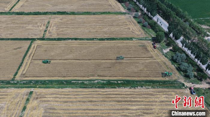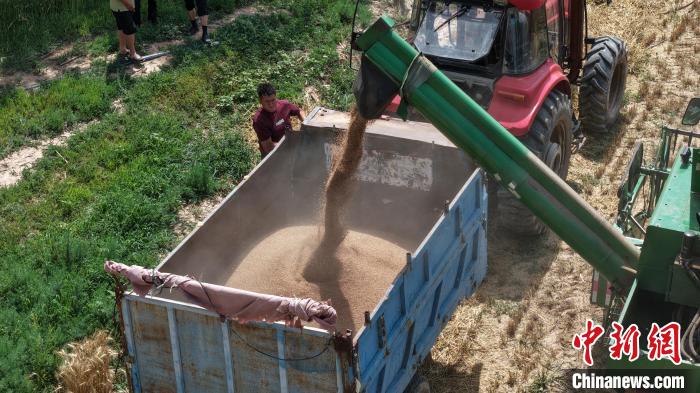 中新网银川7月15日电 (记者 李佩珊)进入7月中旬,骄阳似火。伴随着收割机的轰鸣声响起,一簇簇麦穗被收入囊中,丰收的喜悦洋溢在农户的脸庞,“塞上江南”——宁夏银川市各地小麦喜获成熟,迎接开镰收割。