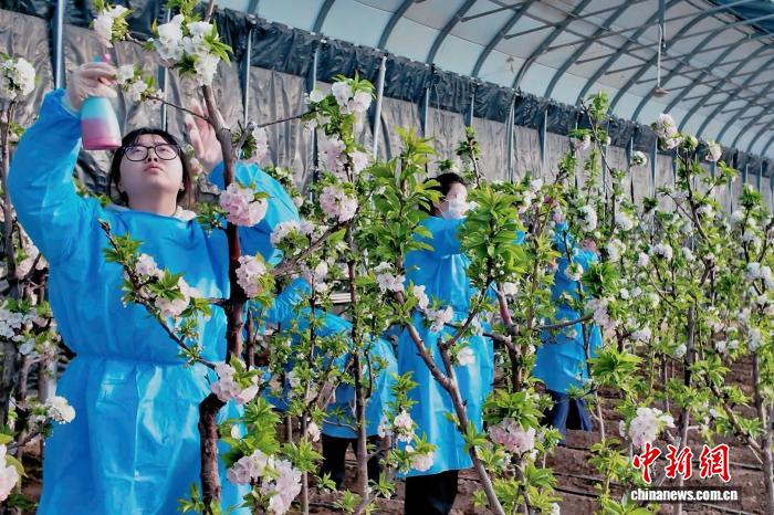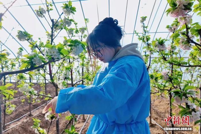 在陆坊村的温室大棚内,20℃左右的适宜温度与棚外零下的严寒形成鲜明对比。村干部与种植户穿梭花丛,手持授粉器,小心翼翼地为樱桃花蕊授粉,手法娴熟利落。“樱桃花开得旺,后续坐果率才有保障。温棚里的温度、湿度都能通过设备精准调控,完全契合樱桃生长的各项需求。”种植户黄金川告诉记者,“樱桃预计春节前成熟上市,现在已经有不少老客户提前咨询预订,不愁销路。”