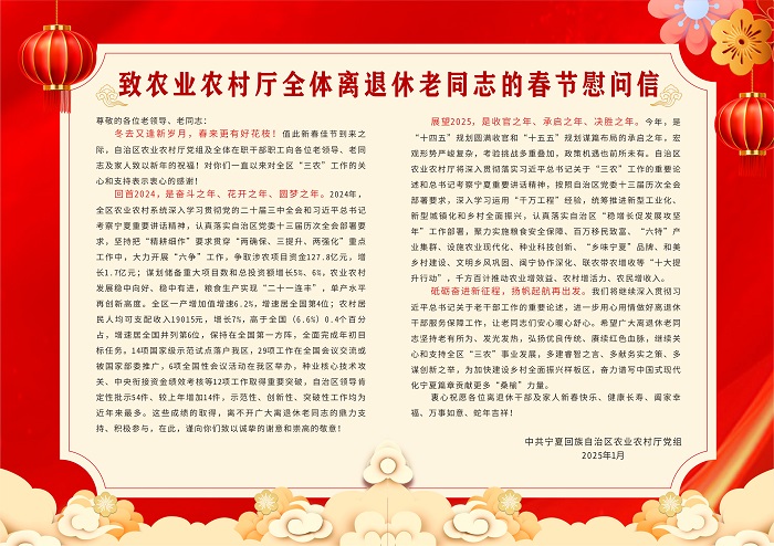 岁寒情暖,慰问情浓。为切实弘扬尊老、敬老的传统美德,表达对离退休老同志的关怀与敬意,在2025年新春佳节来临之际,自治区农业农村厅组织开展“新春走访送温暖、 佳节慰问暖桑榆”活动。由厅领导和机关各处(局、办)主要负责人带队组成35个慰问组,对厅机关250名离退休人员、4名生活困难党员、4名困难职工、9名离退休干部职工遗孀和3个派驻驻村工作队及每村3户困难群众进行了走访慰问或电话慰问,给每位离退休老同志发放一封慰问信,简要通报2024年全区农业农村工作取得的成绩及2025年工作打算,并向他们转达党中央、自治区党委政府及厅党组的关怀,送上了诚挚的新年祝福。