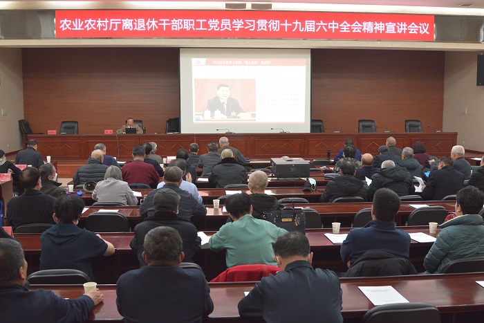 2月25日,自治区农业农村厅组织召开离退休干部职工党员学习贯彻党的十九届六中全会精神专题辅导宣讲会。会议传达学习全国老干部工作先进集体先进个人表彰大会和全国、全区老干部局长会议精神,安排部署2022年度农业农村厅离退休干部工作;邀请自治区党委老干部局“塞上金秋”宣讲团宣讲员周钢宣讲党的十九届六中全会精神。
