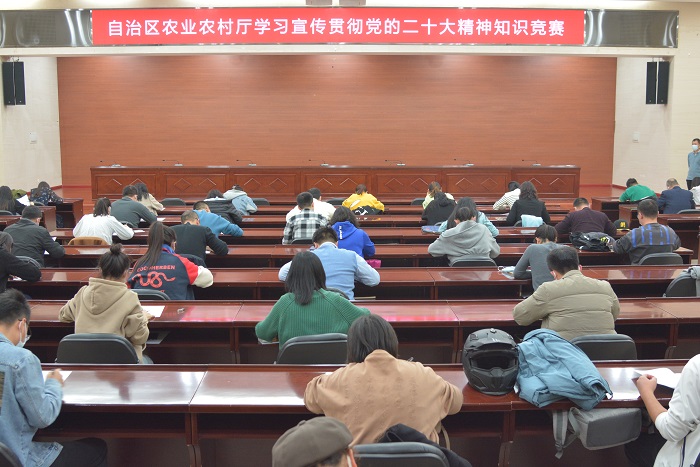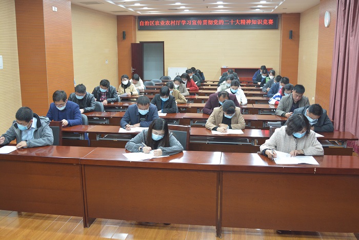 为深入学习宣传贯彻党的二十大精神,在全厅系统迅速掀起学习宣传贯彻党的二十大精神热潮,积极创新学习方式,巩固提升学习效果,11月10日,自治区农业农村厅组织开展学习宣传贯彻党的二十大精神知识竞赛活动。以《党的二十大报告》《中国共产党章程(修正案)》等为竞赛主要内容,采取闭卷答题形式,检验各基层党组织学习成果。各基层党组织高度重视,积极组织党员认真学习相关内容,筛选出37个支部111名党员参加本次知识竞赛活动。