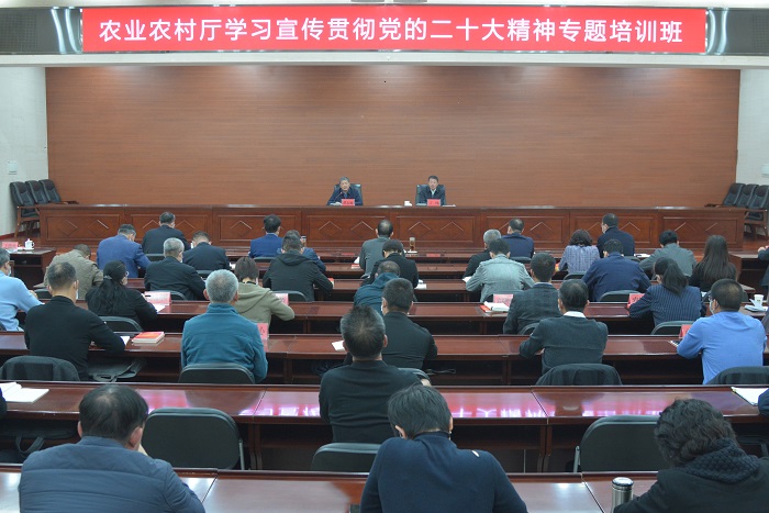培训班强调,全厅各基层党组织和广大党员干部要在全面学习上下功夫,做到学深悟透、融会贯通。认真开展党的二十大精神和习近平总书记视察宁夏重要讲话指示批示精神“大学习、大讨论、大宣传、大实践”活动,原原本本学习党的二十大报告等,深刻领悟“两个确立”的决定性意义,进一步增强“四个意识”、坚定“四个自信”、做到“两个维护”,自觉用党的二十大精神武装头脑、指导实践、推动工作。要在全面把握上下功夫,做到入脑入心、走深走实。全面把握习近平新时代中国特色社会主义思想的世界观、方法论和贯穿其中的立场观点方法,认真落实农业农村厅党的二十大精神《新闻宣传工作方案》和《宣讲工作方案》,坚持领导带头宣讲,通过举办专题宣讲报告会、支部主题党日、书记讲党课等形式,让党的二十大精神进入农村寻常百姓家,实现全区“三农”领域宣讲全覆盖。要在全面落实上下功夫,做到落地生根、见行见效。把贯彻落实好党的二十大精神作为根本,与贯彻落实自治区第十三次党代会部署要求结合起来,扎实抓好年末收官收尾工作,全面系统谋划好明年各项重点工作,全方位夯实粮食安全根基,持续推动“六特”产业高质量发展,全力打造塞上乡村乐园,努力绘就塞上“富春山居图”,加快建设乡村全面振兴样板区,确保党的二十大精神在宁夏“三农”领域落地生根、开花结果,为全面建设社会主义现代化美丽新宁夏、加快建设农业强国作出积极贡献。