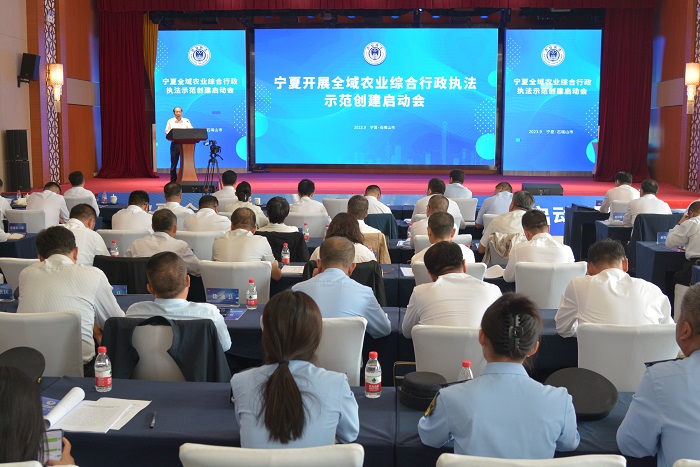 近期,经自治区农业农村厅多方协调、积极对接,宁夏率先开展全域农业综合行政执法示范创建,这是我区首次以农业综合行政执法为主题开展的全省域示范创建,更是全国唯一一个全省域示范创建的省区。9月14日,自治区农业农村厅在石嘴山市大武口区召开“宁夏开展全域农业综合行政执法示范创建”启动会,农业农村部法规司司长王乐君出席会议并讲话,自治区农业农村厅党组书记、厅长王建参加会议并讲话;会议观看宁夏农业执法“慧执法”平台演示,石嘴山市、永宁县、青铜峡市、原州区、西吉县、海原县6个市(县)作交流表态发言,全面安排部署全域农业综合行政执法示范创建工作,不断推进农业综合行政执法规范化建设;自治区农业农村厅党组成员、总农艺师康波主持会议。